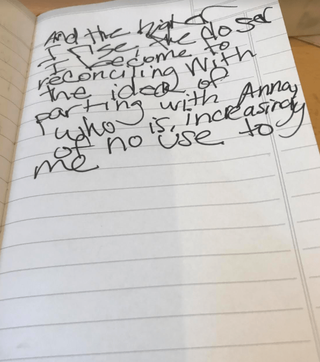 With that, he removed himself from the room, leaving Anna in her hunched over standing position in front of the notebook.