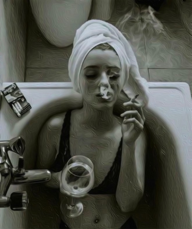 Venla moved closer to the mirror to stare at herself, caressing the reflection of her face before going back into the kitchen for a refill. She spun around on her way toward the kitchen counter, though there was no music playing except the song in her head, The Cardigans’ “Carnival.” It matched the fanciful mood she was in as she kept fortifying her good will with hard liquor. No, she couldn’t possibly imagine anyone from another country enjoying the full weight of what it meant to drink alone in your lingerie. Yes, the Americans and the British most especially would only look like sad, pale, fat sacks just sitting in their own filth with a barley-based alcohol in hand, trying to pass it off as joie de vivre. And everyone knows you can’t intermix French cliches with lesser known Finnish ones like kalsarikänni.