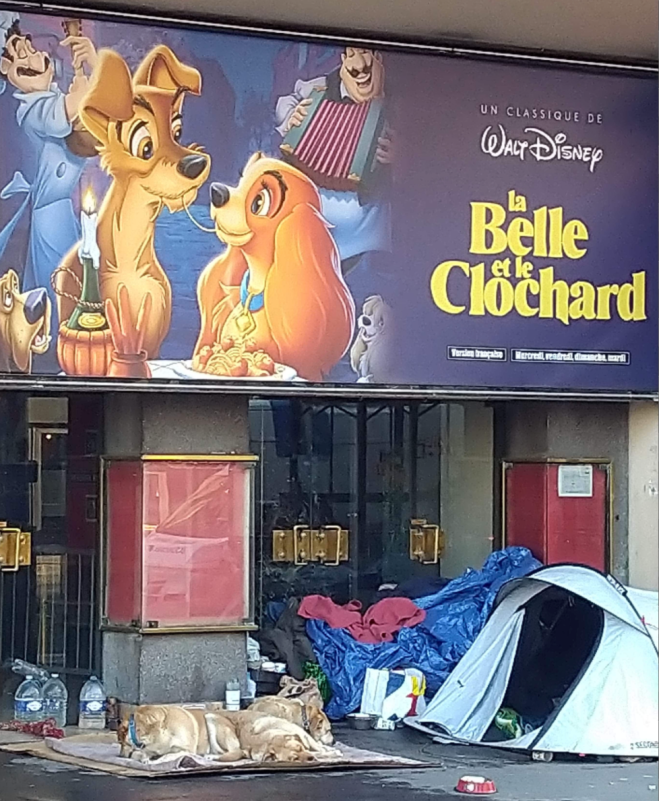 Although she had long hated the job, she was suddenly glad to have work deemed “essential” to Parisian existence. It seemed little else was, even if the French were once determined to declare that art was life. While Oscar Wilde instead said that, “Life imitates Art far more than Art imitates Life.” In the case of what Gisele was presently bearing witness to on her way to work, it appeared Strife imitates Art as best as it can with such limited resources. That’s what the image of three dogs “belonging” to the gypsy types Paris was known for expressed in positioning themselves underneath a giant poster of Lady and the Tramp that the movie theater had boasted “showing” for the majority of the year. Since the shutdown, of course, no movie theater was showing anything (except to the rats), and Disney reaped the benefits of perpetual free advertising.