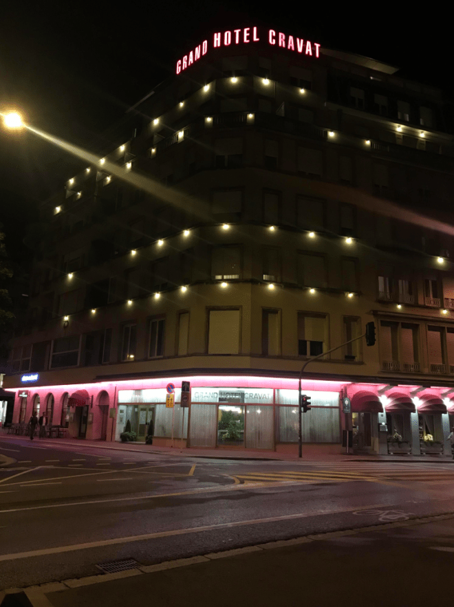 It was both commanding and discreet at the same time. It was not the sort of place one would immediately assume was a hotel. It looked like any average European apartment building, really. In fact, the only thing that differentiated it as a hotel was the fact that emblazoned near its rooftop were the words Grand Hotel Cravat (not to be confused with Grand Budapest Hotel). Yet if you walked past it in the day, you would never notice the moniker looming above. It wasn’t until nighttime that the demon-red glow of the letters could really make an impact.