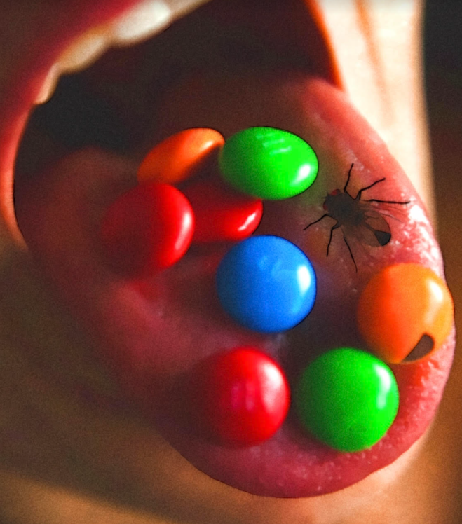 This Kristina thought to herself as she shoved her maw full with another mass of M&Ms, thinking that she could do it quickly enough to avoid the risk of the fly managing to enter her mouth—this being among her top ten fears in life: bugs gaining egress into one’s holes. It had actually happened to her before as a fifth-grade-aged child. She was eating lunch (a PB&J sandwich because, what else?) outside among the other docile students. As she opened her mouth to take a bite, still too young and naïve to understand that every source of enjoyment in this life must be quashed and overshadowed by something horrible, she was too slow to notice the bee that had homed in on her open boca, going in for “the kill” by crawling right inside just as she bit down on her sandwich, now bee body-filled in addition to PB&J-filled. And yes, for its swan song, it was able to sting the interior side of her mouth so that her right cheek swelled up like a balloon, garnering her the permanent nickname throughout the rest of her school days as “Chipmunk Cheek.” Oh the curse of having to attend school with the same people from the very beginning of one’s so-called education.