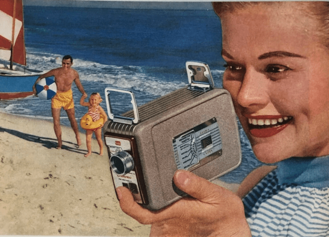The truth was, the equipment for “amateur filmmaking,” as it was once elegantly deemed, existed decades before then. For it was the 16mm Ciné-Kodak camera that first became available to the public in 1923. As for Ricky Ricardo (Desi Arnaz), his own home movie equipment would be fresh out of (March 1,) 1954, the air date of the episode in question, hence his enthusiasm for showing the Mertzes the same footage over and over again, this time on a new screen he’s bought to improve the quality of the projection. Ethel (Vivian Vance) tries to explain away Ricky’s annoying behavior to Fred (William Frawley) with, “It’s his first movie camera and his first picture he’s got of the baby.” Fred retorts, “Count me out. If I want to see old movies, I can stay home and watch television.”