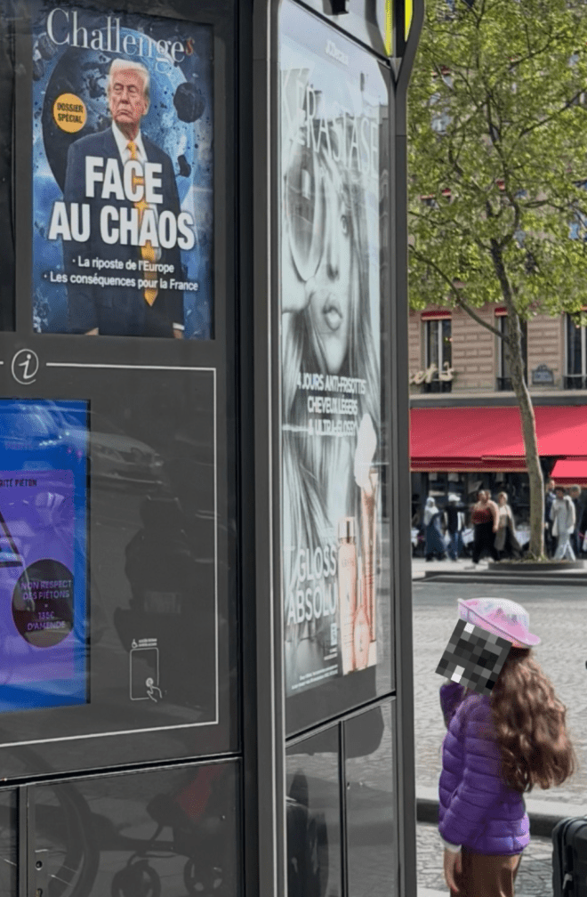 The girl staring into Sydney Sweeney’s giant face like the abyss that it was might have been an American. After all, she was standing next to some adults with suitcases, so perhaps they had just arrived. Fresh in town to enjoy their hotel stay on the Champs-Élysées, the only location more cliché than the Eiffel Tower and Notre-Dame in terms of where the most basic tourists like to be situated. In any case, if this girl in the floppy hat (or “Blossom hat,” for those attuned to the 90s) really was American, perhaps the ominous presence of the Orange One next to her newfound idol was “nothing scary” because, ultimately, it was nothing new. She was of an age where she had never known a world that wasn’t dominated by this beast (in all likelihood she wasn’t even sentient during Biden’s presidency—then again, neither was Biden). Had never known a world that wasn’t total shit.
